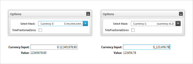 CurrencyInput, configured for dealing with monetary values, provides real-time input validation to a currency format.