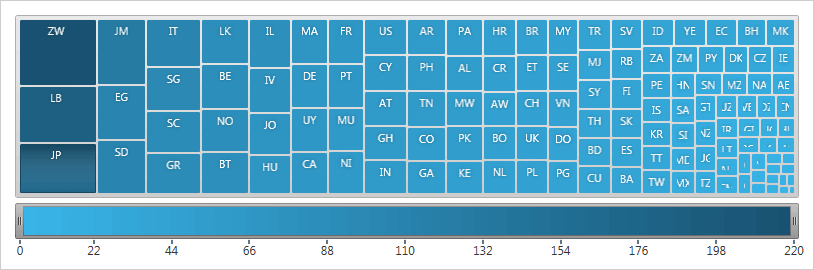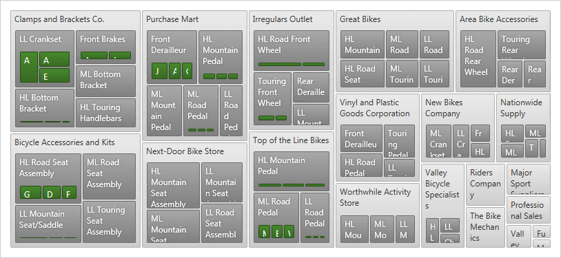 Show users the relative weighting of data points at more than one level with WPF treemaps (also known as heatmaps in the financial industry) supporting strip, squarified, and slice-and-dice algorithms.