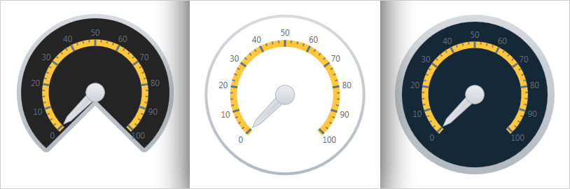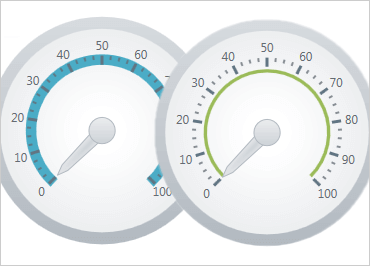 Control the start and end positions of the scale, major and minor tick marks, labels, color ranges, and sweep direction. Create full 360 degree scales, or half-circular gauges with (180 degree, 90 degree, or 45 degree scales) or any custom value you want.