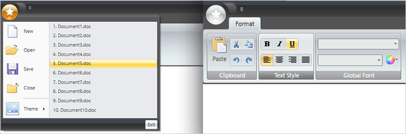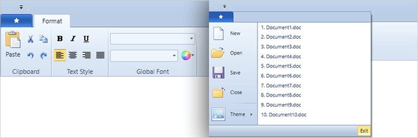 We've added the Microsoft® Office® Application Menu 2010 (also known as Backstage) functionality so developers can add easy access to task-centered functions in the WPF applications. The Backstage feature of the Ribbon control displays information (unrelated to the current, active stream) to the end user.