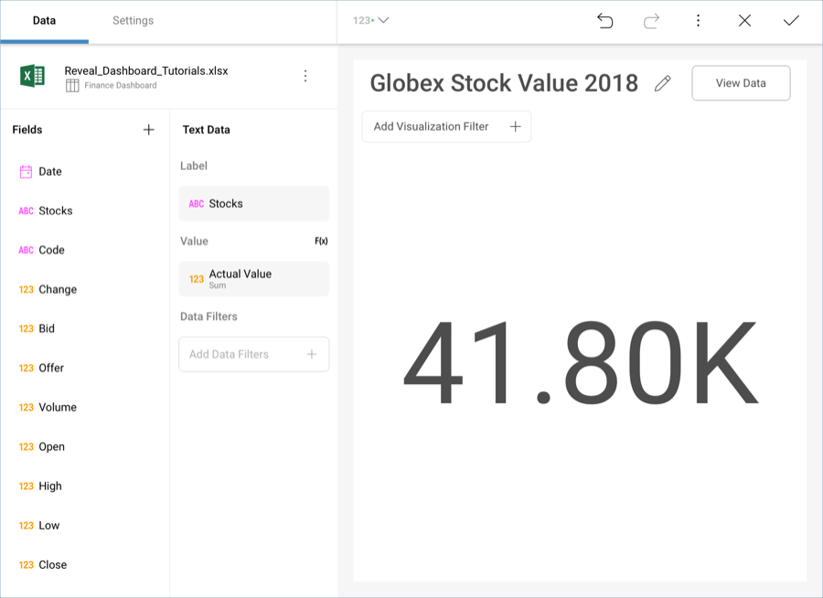 Let’s focus on creating the "Globex Stock Value 2018" visualization in the sample dashboard presented at the beginning of this tutorial. The visualization displays a Text Gauge. This particular visualization displays two fields: