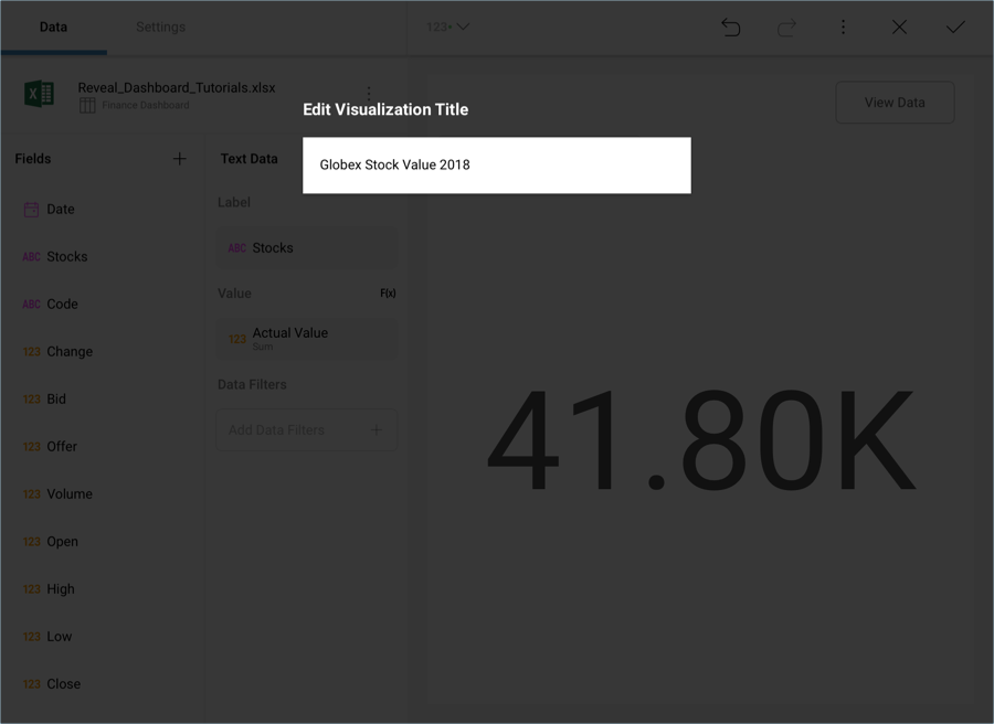 Lastly, change the visualization’s title to "Globex Stock Value 2018" by selecting the pencil icon next to the "Finance Dashboard" title.