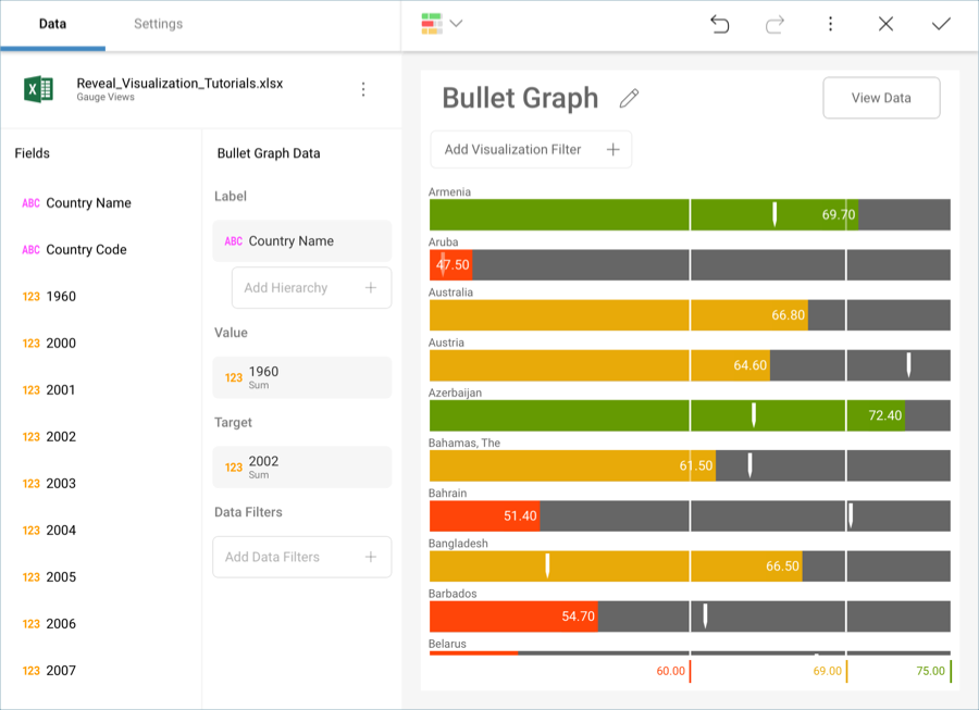 The Bullet Graph adds a new visual indicator to the Linear gauge, a vertical mark that is based on a target value from the Target placeholder. This new indicator is retrieved from a numeric column, meaning that you need two numeric columns and a text column to configure this view.