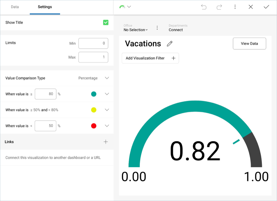 Band Configurations are based on your original data, not on the formatting applied through Reveal. In the circular gauge above, the original data is expressed in percentages, even though the visualization was formatted to display a number. Therefore, the selected Value Comparison Type is Percentage, and the ranges are defined as percentages and not numbers.