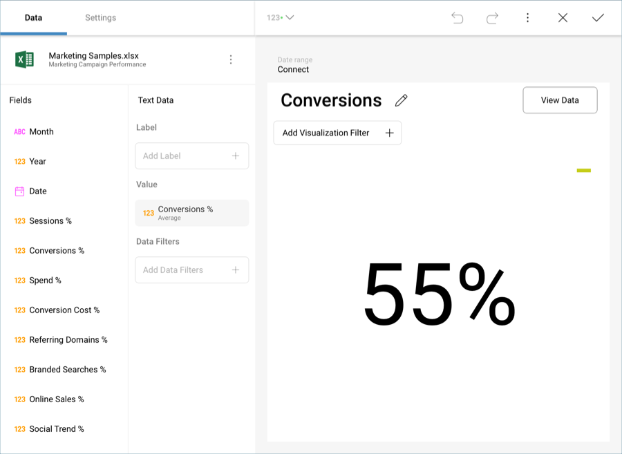 The Text Gauge displays the Value column data in a large font. This flavor is suitable for very high priority metrics. By default, the gauge will visualize the data from the Value column for the first data row unless any filters are applied so that the chosen data row is different.