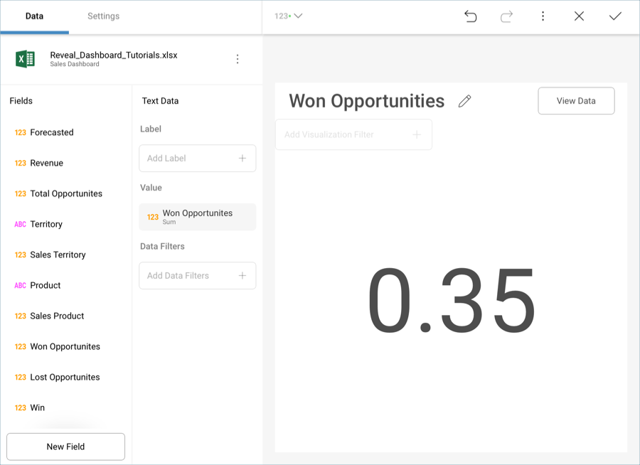 Let’s focus on creating the "Won Opportunities" visualization in the sample dashboard presented at the beginning of this tutorial. The visualization displays a Text Gauge.
