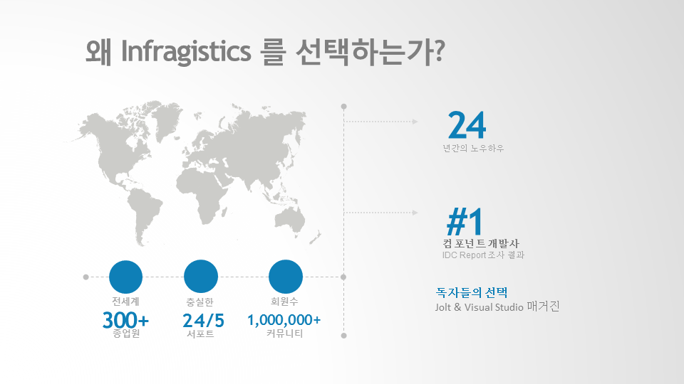 인프라지스틱스는 전세계 수백만의 웹, 윈도우즈 애플리케이션, 모바일 애플리케이션 개발자들에게 인정받고 있는 최고의 사용자 인터페이스 개발용 툴입니다. 특히 많은 포춘 500 기업에서 사용되고 있으며, 생산성과 비지니스 효율성을 높이기 위해 도입한 SharePoint 용 모바일 애플리케이션 SharePlus 와 데이터 대시보드 제작툴인 ReportPlus 등도 제공하고 있습니다. 인프라지스틱스는 모든 제품에 최첨단의 기술을 이용하여 최고의 사용자 경험을 제공합니다.