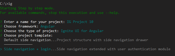 ig new "Auth Project" --framework=angular --type=igx-ts --template=side-nav-auth