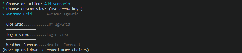 Ignite UI CLI supports multiple component templates, as well as some more elaborated scenario templates, that can be added to a project. This mode can be activated either after completing project creation or inside an existing project using the commands below.