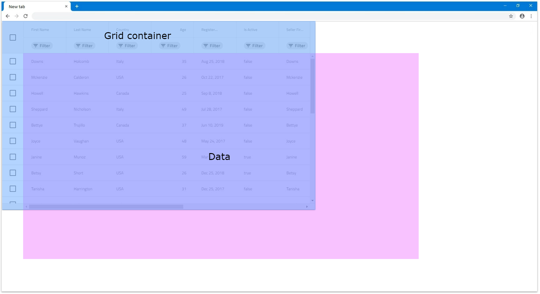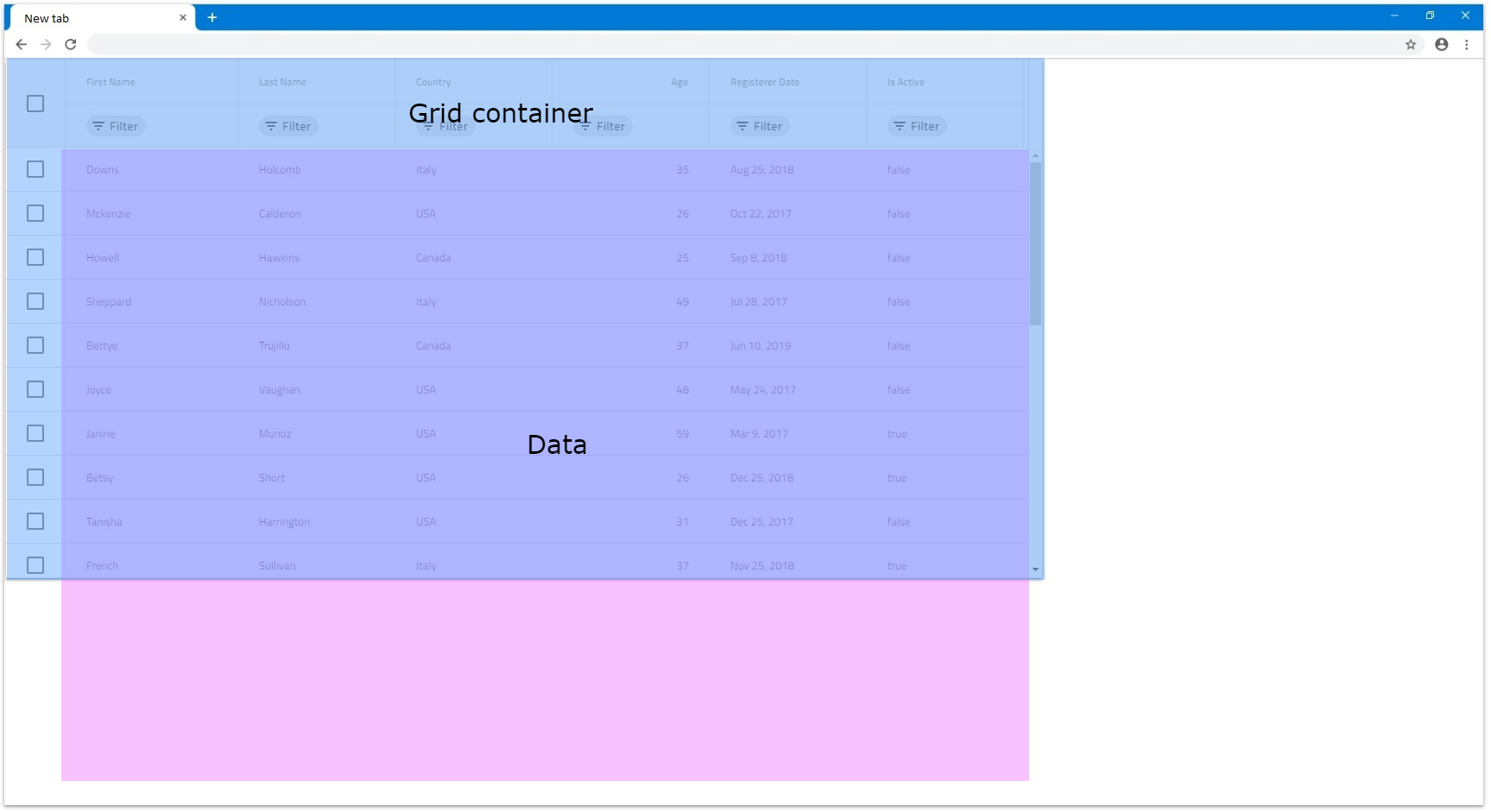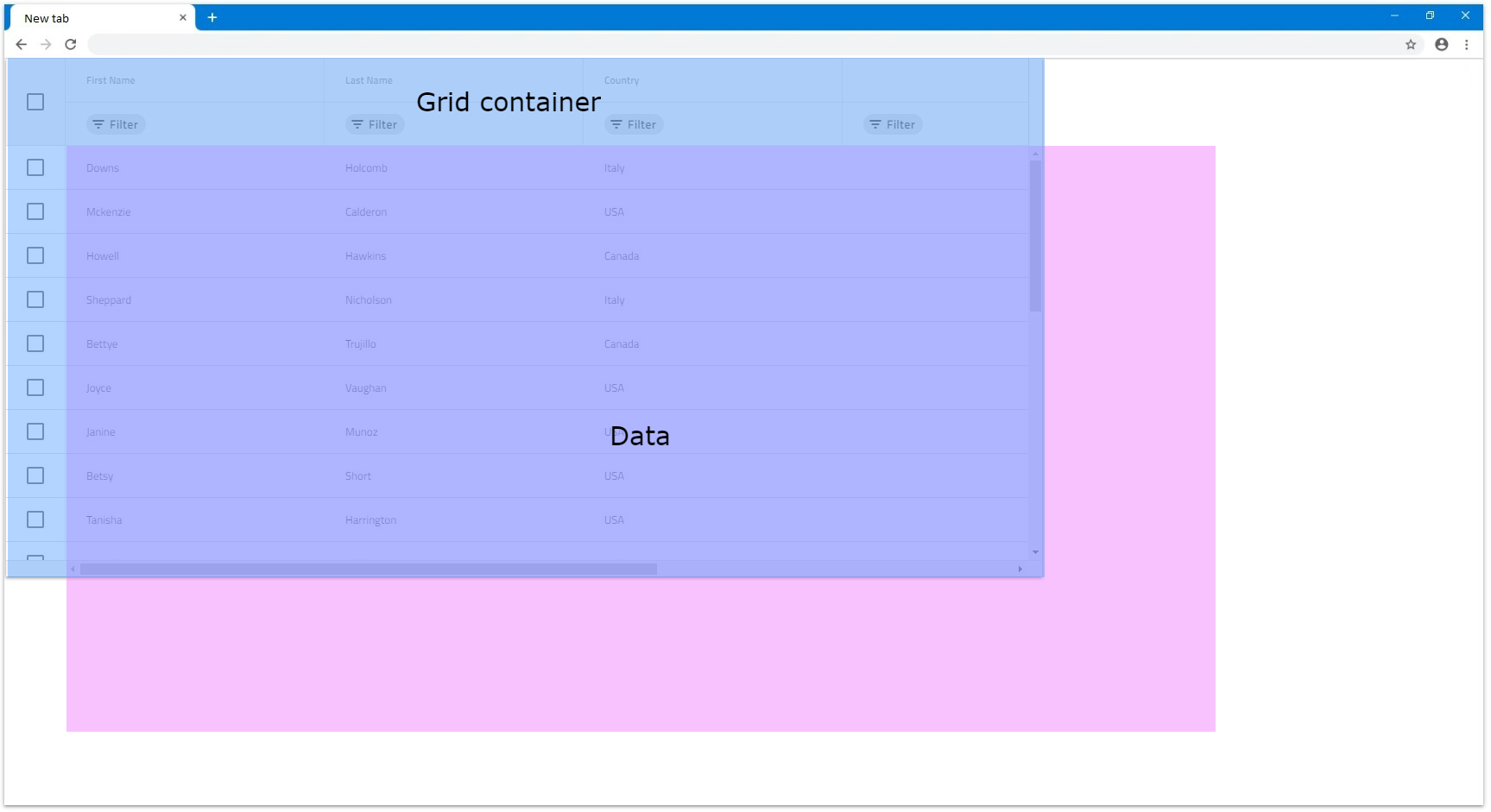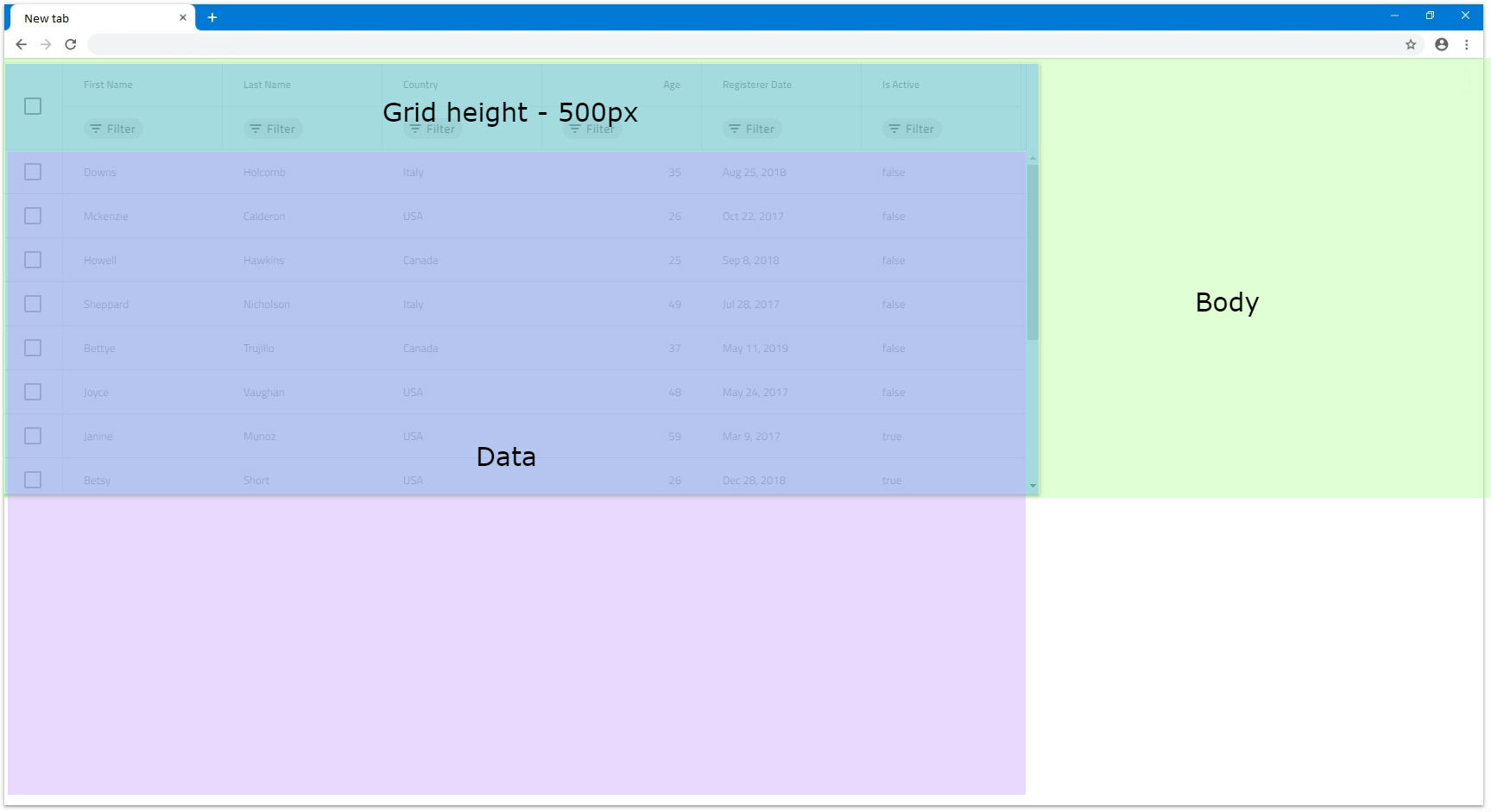If we have 24 rows instead, the grid will still render all rows but since they are too many, they exceed the browser boundaries. That's why the browser itself will render vertical scrollbar by default so the user can scroll down to the rest of the rows.