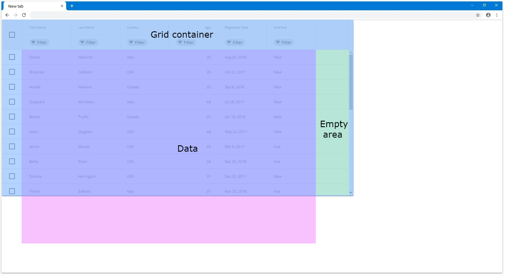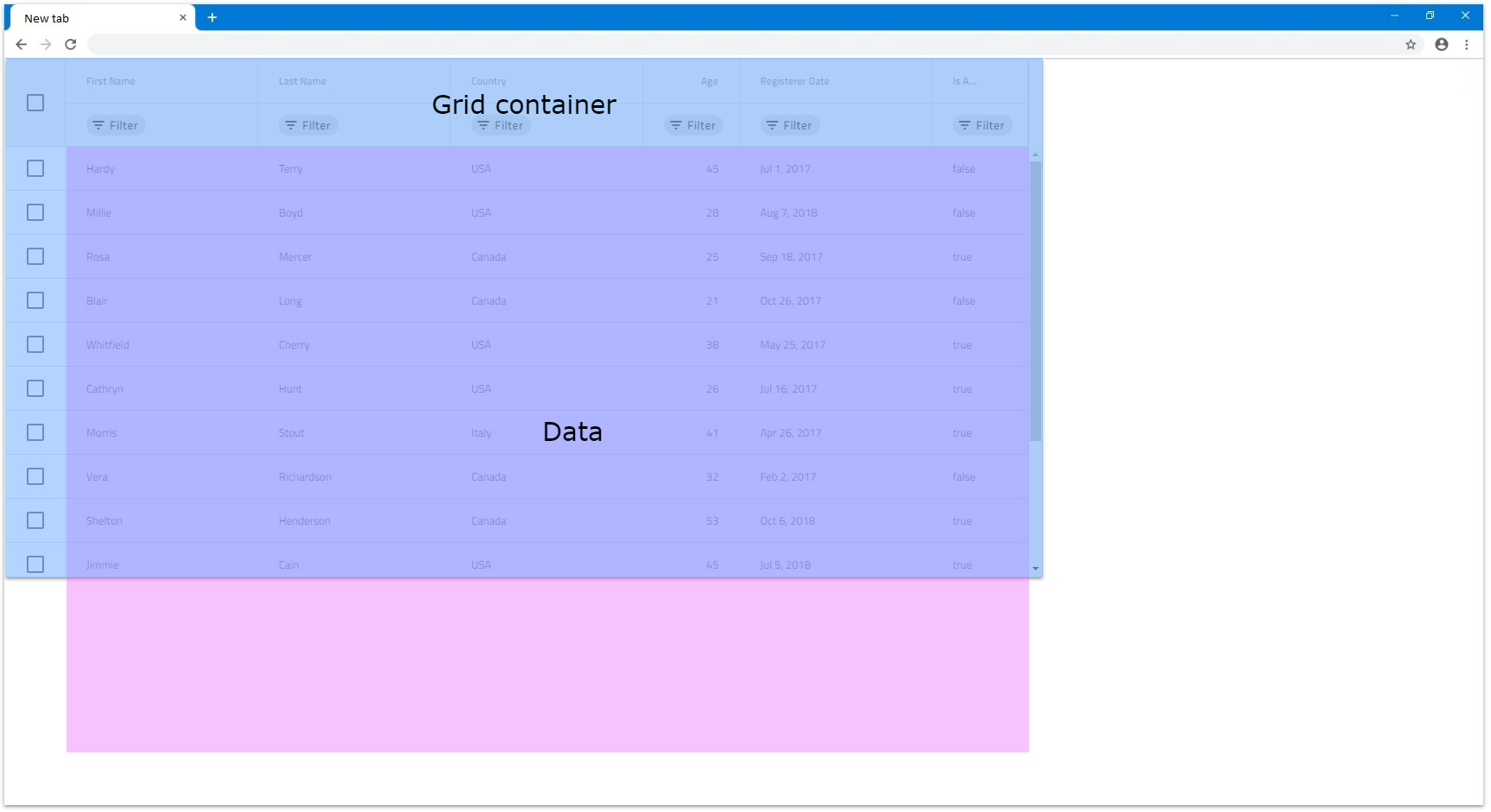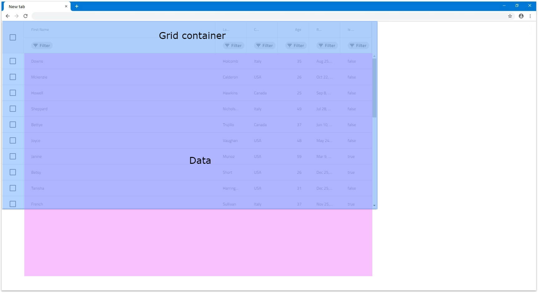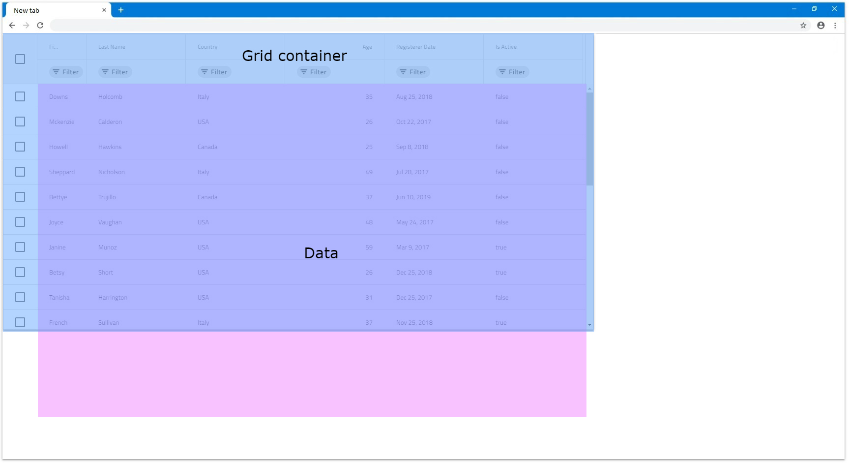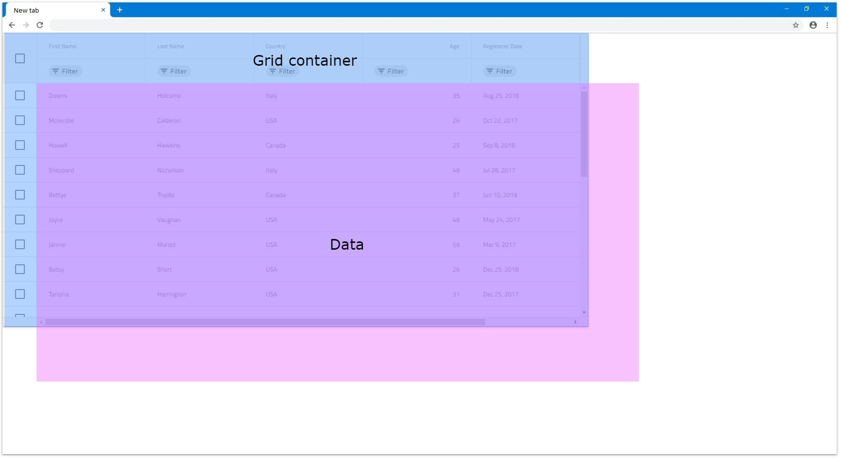 If we have 24 rows instead, the grid will still render all rows but since they are too many, they exceed the browser boundaries. That's why the browser itself will render vertical scrollbar by default so the user can scroll down to the rest of the rows.