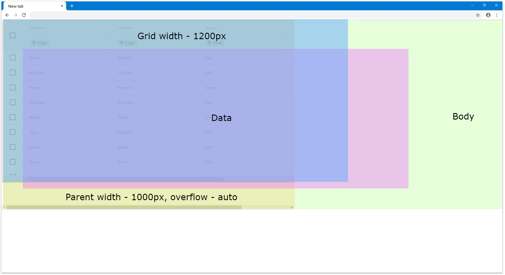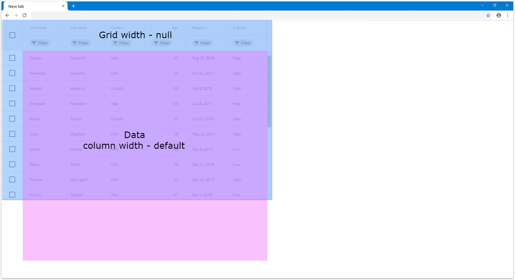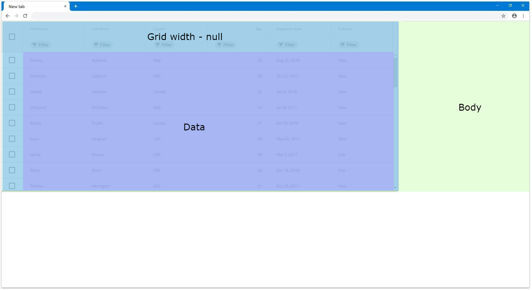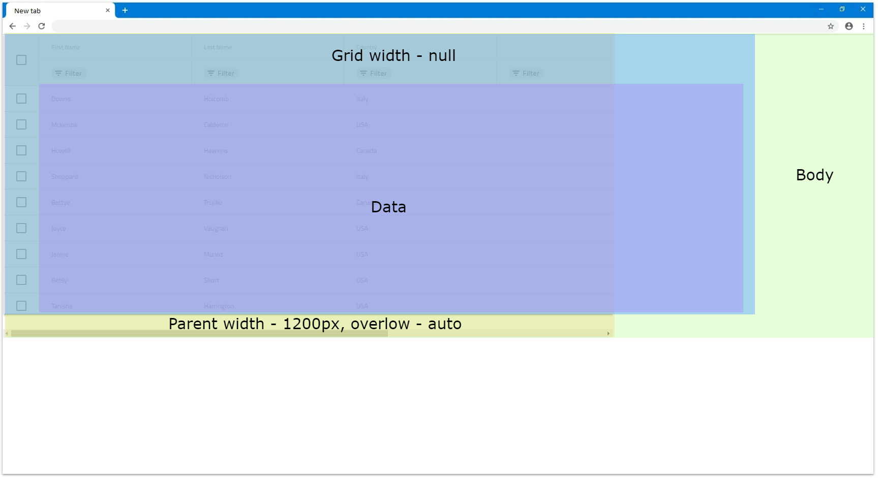 Due to this behavior, if the grid data contains too many columns, it might have significant impact on the browser performance, since all columns would be rendered without virtualization.