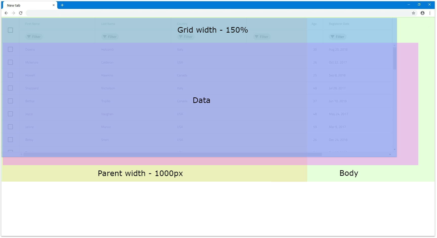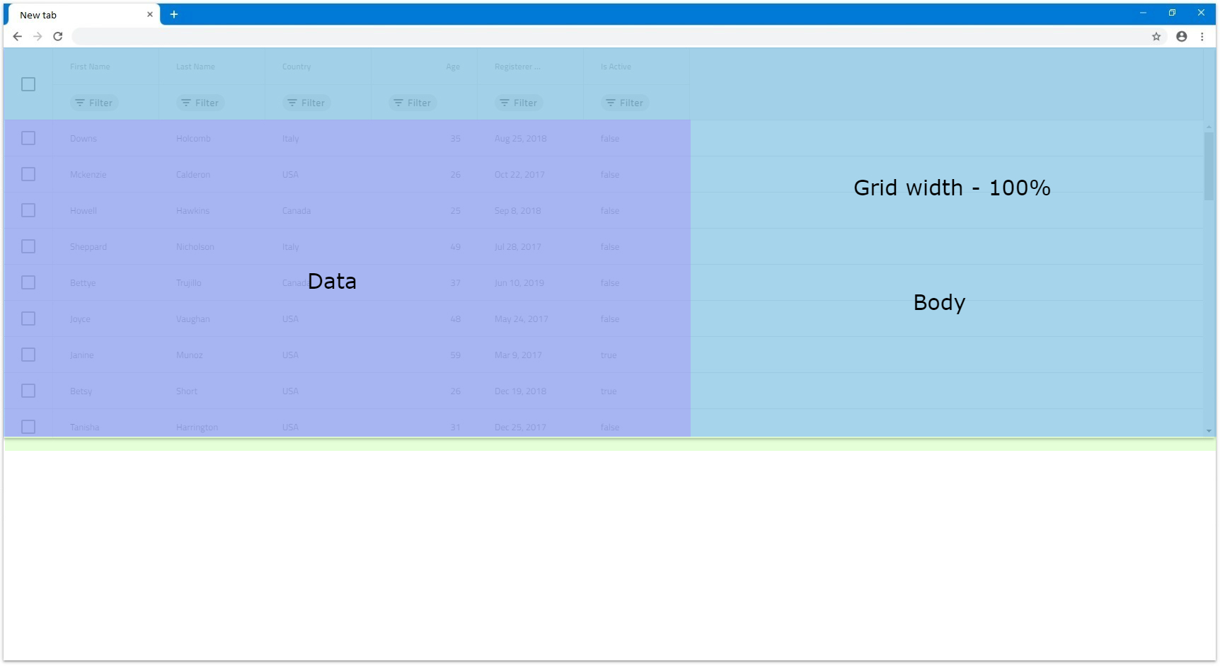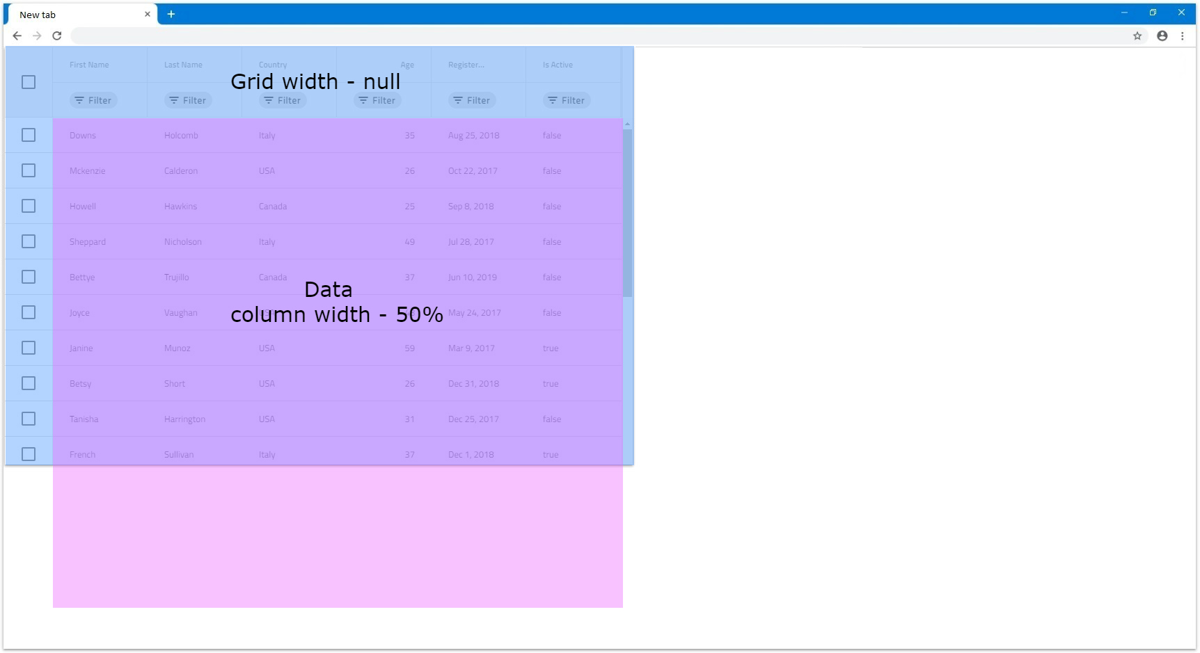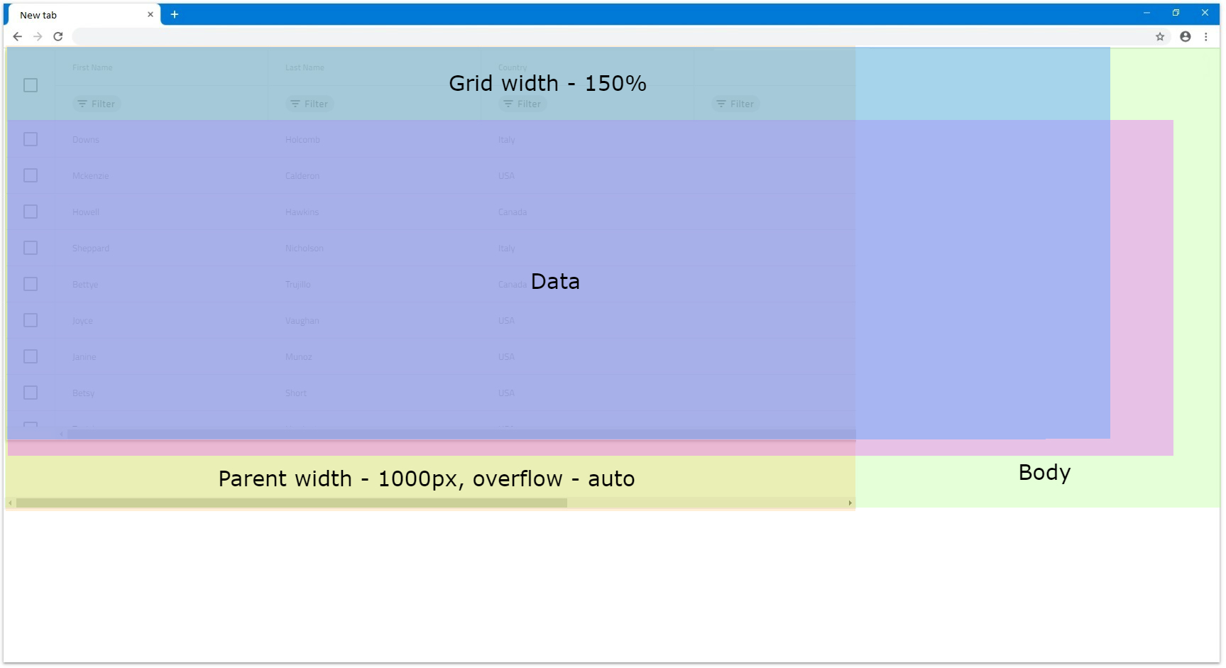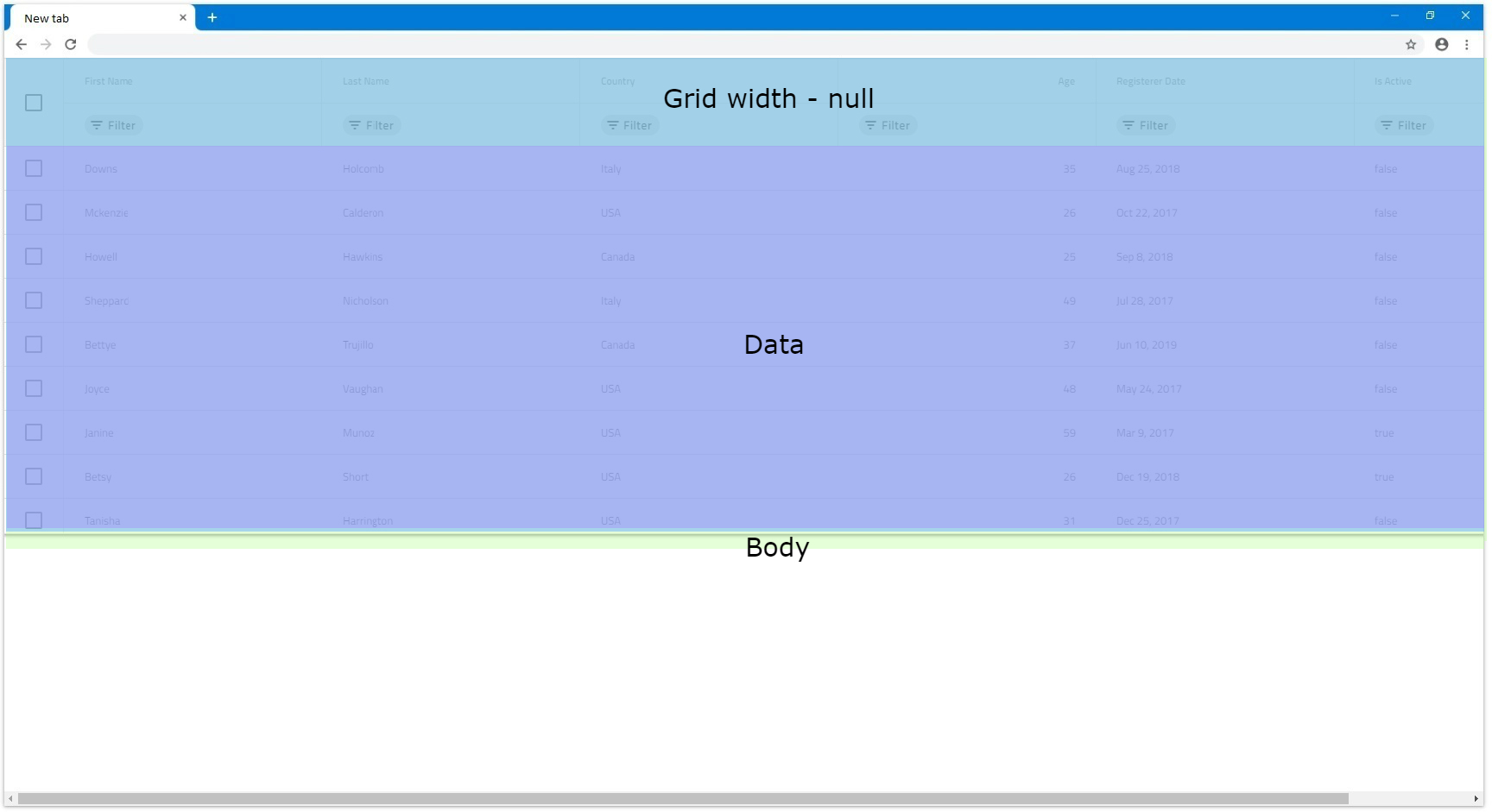 Due to this behavior, if the grid data contains too many columns, it might have significant impact on the browser performance, since all columns would be rendered without virtualization.
