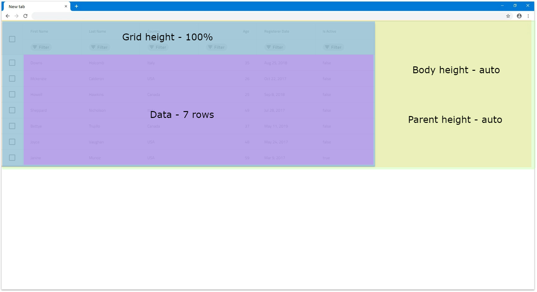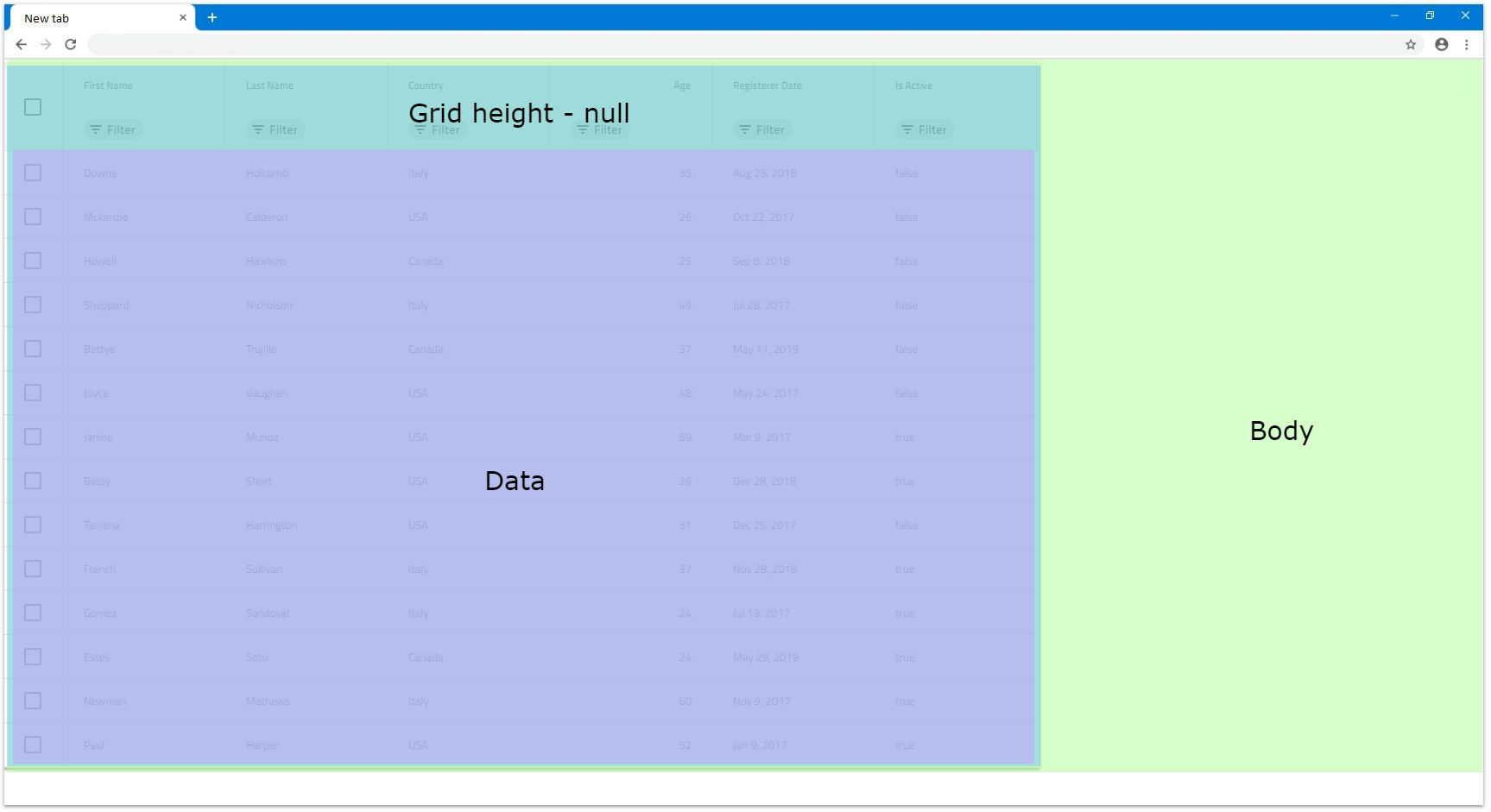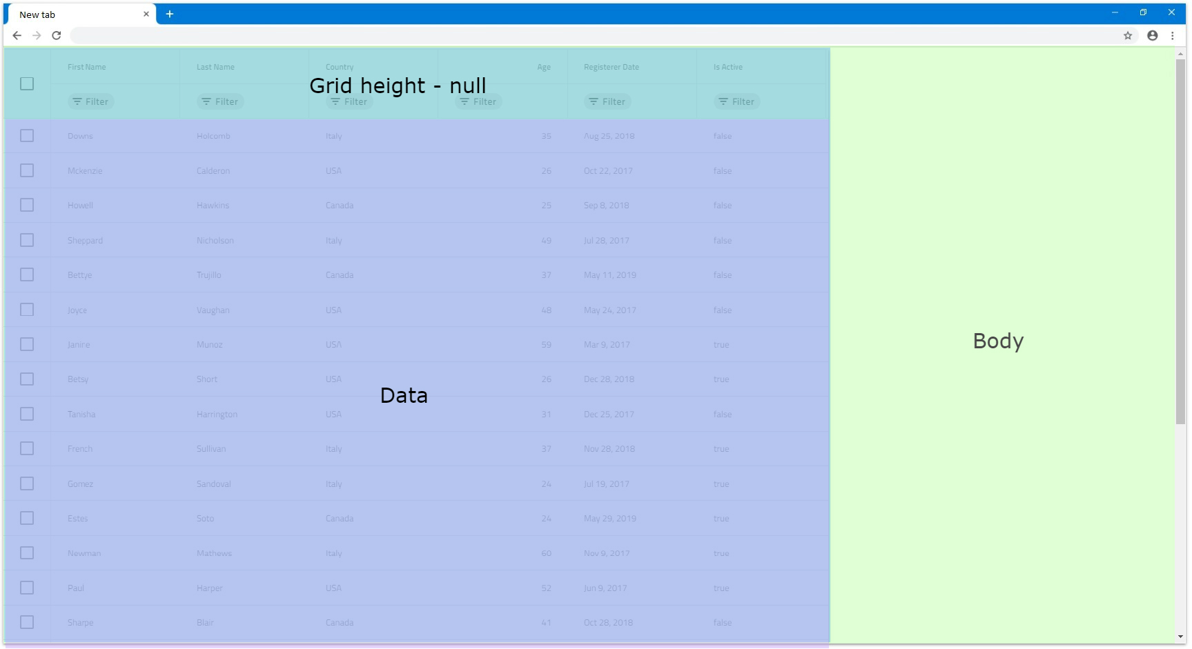 value, which when set, displays all rows with no scrollbar no matter how many they are. In this case, there is no vertical virtualization since the grid renders all rows anyway.