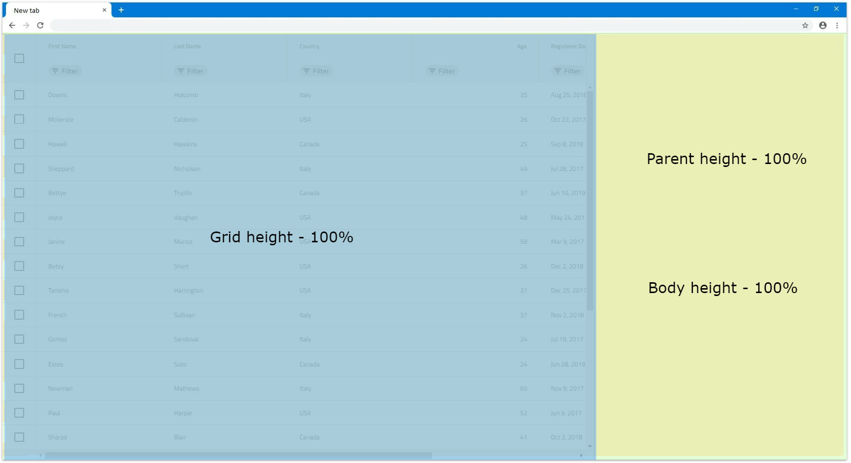 When the parent element does not have defined height, the browser does not assign height to it initially and sizes it based on its children and their size. That is why there is no way for the grid to know what base height to use in order to apply percentage sizing based on it. For this reason, it will render a maximum of 10 rows and if they are more rows, a vertical scrollbar will be rendered. Otherwise, the grid will fit to number of rendered rows. We will look in this scenario in more detail in the next examples.