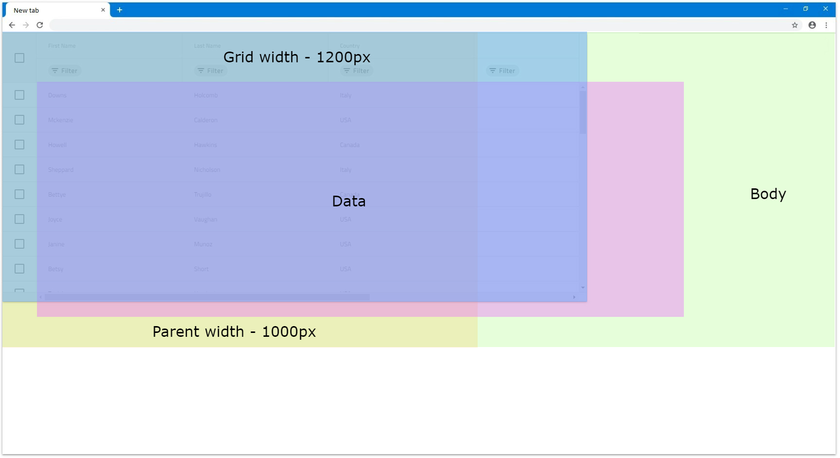. In this case a horizontal scrollbar will be rendered.For scenarios where the grid has a parent element, it depends on the parent styling if it will render scrollbar or not. Everything else related to the grid itself is still retained. If the parent element width is smaller than the grid's width and has overflow style set to
