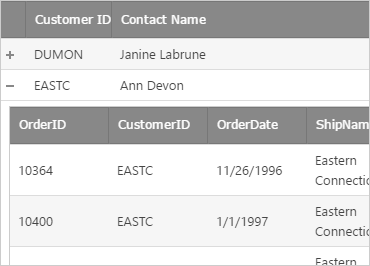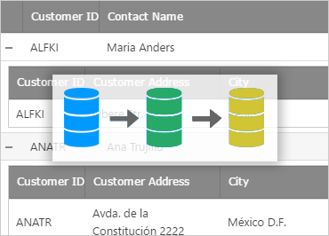 WebHierarchicalDataSource는 SqlDataSource와 같은 기존 ASP.NET 데이터 소스 제어와 함께 작동합니다. 데이터를 .NET 개체 또는 관계형 데이터베이스에서 가져온 단일 통합 계층 보기로 통합해보세요.